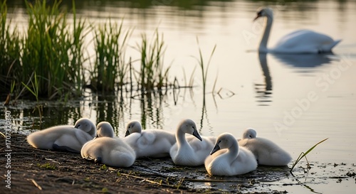 A duck and two ducklings swim in calm water near tall grass, bathed in golden sunlight creating shimmering reflections.