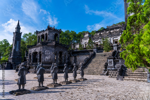 A wide view of the Khai Dinh Tomb's courtyard, featuring rows of stone statues and an ornate, dark monument under a bright blue sky.