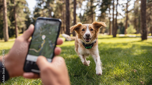 Happy dog with GPS collar running in park, person tracking location on smartphone, outdoor scene, sunny day, playful moment, smart pet technology.