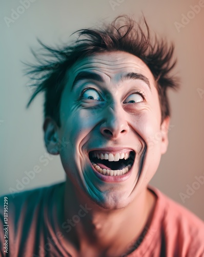 Portrait of a person, filled with a look of amazement and craziness with expression