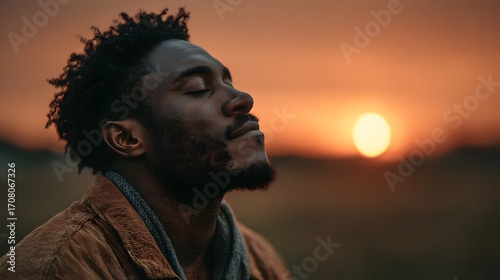 Side profile of a young Black man with his eyes closed in peaceful contemplation, basking in the warm, golden light of a beautiful sunset.