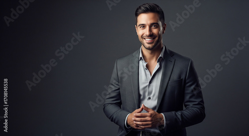 Smiling, confident handsome businessman in a stylish suit, hands clasped, Ideal for business and corporate themes