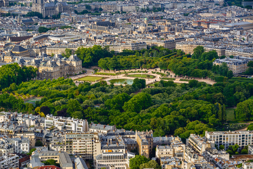 Summer aerial view on the Luxembourg Garden, Luxembourg Palace and rooftops in the center of Paris. 6th Arrondissement, Left Bank. France