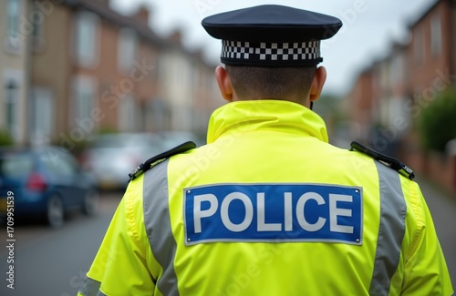 British police officer in high-visibility jacket, hat on duty, patrolling residential street. Uniformed law enforcement maintaining public safety, order. Close-up from behind, focusing on jacket
