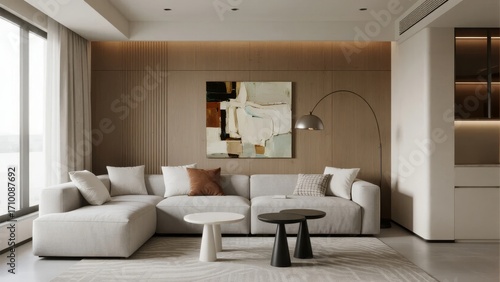 Modern minimalist living room with light-colored sectional sofa, abstract wall art, and wooden accent wall