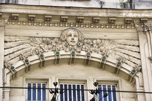 Zbliżenie fasady budynku z misternymi rzeźbieniami, rzeźbioną twarzą i ozdobnymi elementami kwiatowymi, świadczące o kunszcie wykonania charakterystycznym dla historycznej architektury.