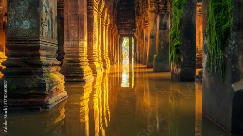 Stone and old architecture of the Angkor Wat temple with its reflection in the water at night