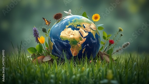 A symbolic globe nestled among natural elements, representing harmony with the environment.