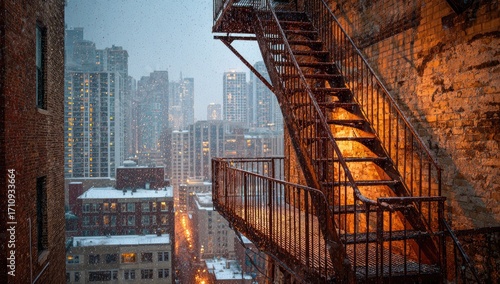 Rusty fire escape in winter city
