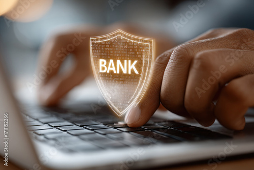 Close-up of hands on a laptop with a translucent shield labeled BANK hovering over the keyboard, symbolizing digital protection, cybersecurity, and safe online banking in a modern finance setting.