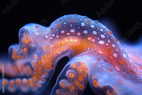 Close-up image of a translucent jellyfish, adorned with orange spots possibly nematocysts Captured underwater with ethereal quality and focus on the subject due to dark background - AI-Generated