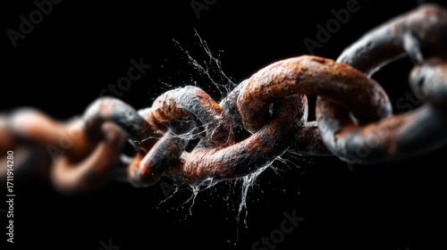 A powerful image captures the moment a rusty chain breaks, with dynamic water splashes frozen in time, representing strength and fragility intertwined in a striking visual display.