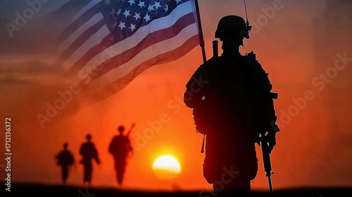 Soldiers walking at sunset while one holds an American flag to honor service and sacrifice during a military operation