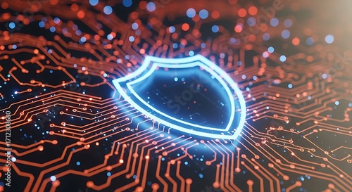 Glowing blue shield icon on a circuit board background with red and blue light effects, representing digital security and protection