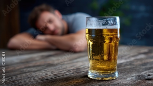 Adult male unconscious on a rustic wooden table with a glass of golden beer. Represents alcohol abuse, physical dependence, binge drinking, and withdrawal syndrome.