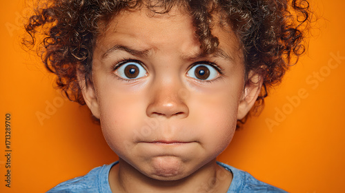 A young child with an expressive face, showing confusion and curiosity, looking directly at the camera with wide eyes and raised eyebrows against a vibrant orange background.