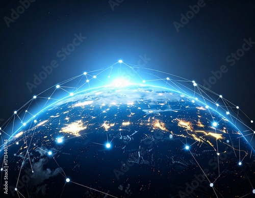 A vibrant blue Earth seen from space, enveloped by a glowing digital network grid, symbolizing global connectivity and technological advancement.