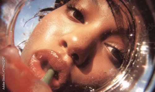 Woman looking through glass. Creative close-up portrait with reflective surface. Unique perspective and artistic shot for advertising and editorial use.