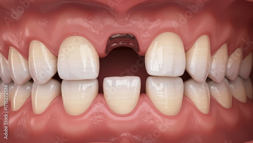 Dental Imperfection: A detailed depiction of a human mouth exhibiting an empty socket after a tooth loss.