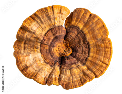 brown bracket fungus conk from top view with concentric rings and woody texture on isolated background