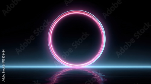 A vibrant pink and light-blue neon ring, glowing brightly against a dark background, is reflected in a still, dark-blue body of water. The ring's double-lined structure creates depth