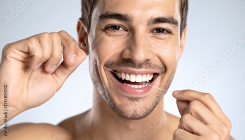 Primer plano de persona utilizando hilo dental entre los dientes para su limpieza. Higiene, salud, boca, frescor