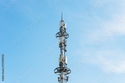Global 5G network infrastructure: high-speed wireless communication tower under blue sky