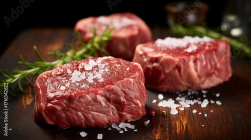 Pièce de viande de boucher. Morceaux de pavé de boeuf. Viande rouge. Viande crue avec des morceaux de gros sel et des herbes de Provence disposé sur une planche d'ardoise. Cuisine, aliments.