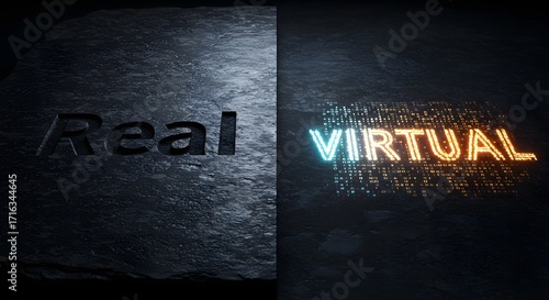 A conceptual illustration of the dichotomy between the tangible real world carved in stone and the luminous digital virtual world