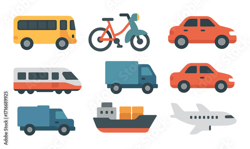 Colorful transport icons featuring bus, bike, car, train, truck, ship, and airplane