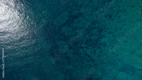 Aerial view of the azure surface of the Mediterranean Sea. The water is crystal clear and blue. Ideal for background, texture and pattern.