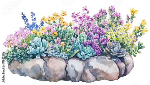 A watercolor illustration of a lush flower bed featuring a variety of colorful blooms and succulents arranged on a rocky base. set against a clean white background. ideal for botanical art enthusiasts
