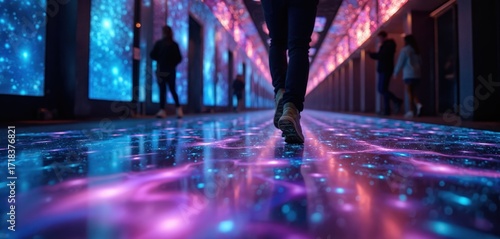 Visitor walks on illuminated interactive floor projection mapping installation art. Futuristic, immersive experience with digital lights, vibrant colours. Abstract, modern, creative design for