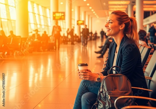 Young woman traveler sitting at airport terminal with coffee cup, smiling and waiting for flight, modern travel lifestyle scene with sunlight reflections, journey preparation and business trip mood.