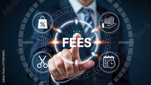 Businessman s finger touches digital interface displaying the word fees surrounded by icons representing costs and charges