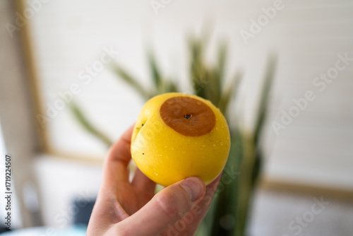 Close-up of a hand holding a yellow apple with a large brown spot, concept of rotten fruit, damaged apple, unhealthy food, organic imperfection, food waste and natural defects.