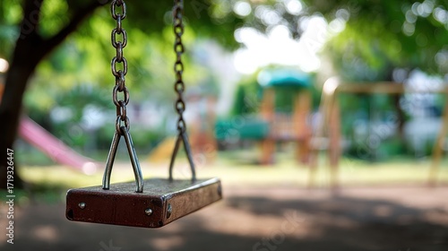 A solitary swing set with blurred background on sunny day, inviting childhood nostalgia