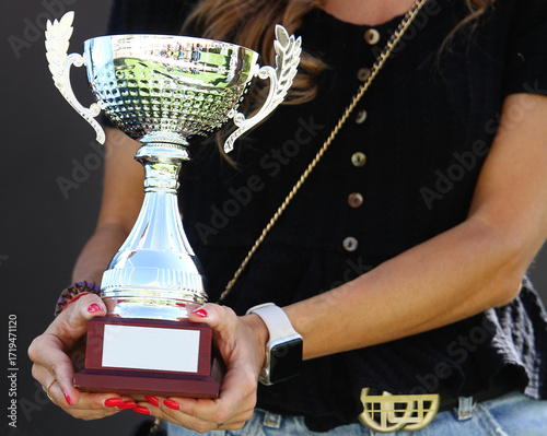 Mujer con copa trofeo de plata en sus manos recogiendo premio de reconocimiento tras logro y ganar campeonato