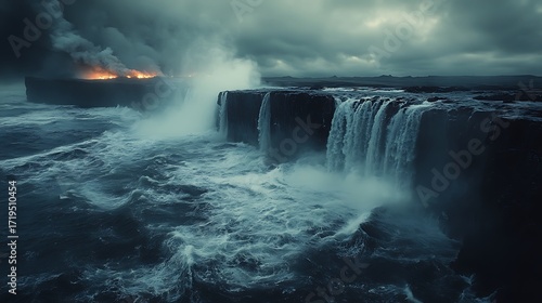 Dramatic waterfall cascading over a cliff under a stormy sky, with smoke rising from a distant fire, creating a sense of impending doom and destruction