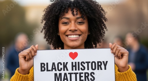 Black history matters sign held by a smiling woman of color. Woman with afro hair is holding black history matters sign outside on a sunny day.