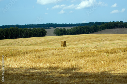 Krajobraz pole uprawne snopy żyta na tle nieba i lasów żyto pszenica chmury.