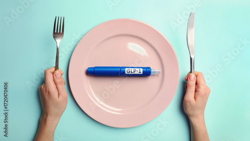 GLP-1 injection pen on plate, weight loss therapy concept, hormonal treatment and appetite control, obesity medication, modern healthcare symbolism