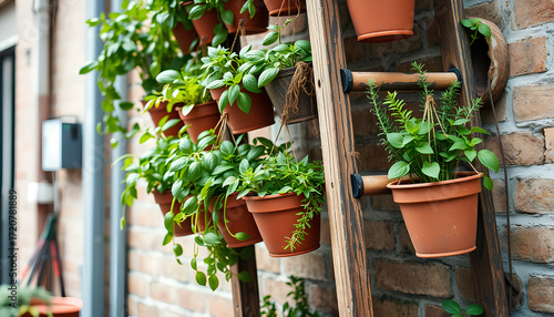 DIY vertical garden made from recycled ladder frame and hanging pots with edible plants like basil, rosemary, and thyme, urban farming concept, 2