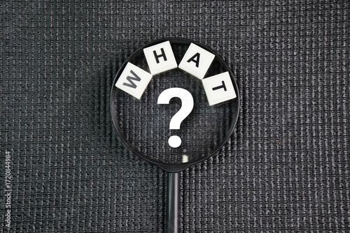 Magnifying glass and icon with the question mark word what? asking for information specifying something.