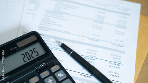 A black calculator showing 2025 placed on top of financial documents with a black pen nearby. The setup conveys focus on current financial reports and future investment direction.