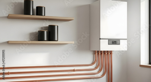 connected to copper pipes, showcasing sleek design and functionality, Modern tankless water heater mounted on a wall in a clean, organized basement utility room