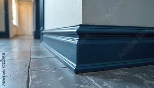 Deep blue baseboard trim detail at room corner. Ornate molding features texture, depth. Clean, contemporary interior design element. Tiled floor shows subtle wear. Modern home improvement, renovation.