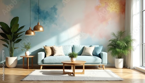 Serene living room features light blue sofa, abstract wall mural with pink, blue, gold tones. Elegant pendant lights, rich green plants, wooden coffee table, white rug create peaceful home decor