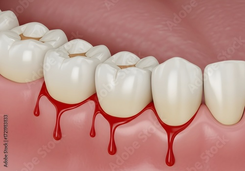 Close up of teeth with bleeding gums indicating possible gingivitis or periodontal disease issues