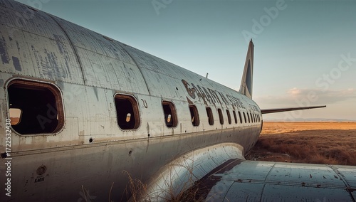 Abandoned airplane fuselage in a field under a clear sky, showcasing weathered metal and rustic elements